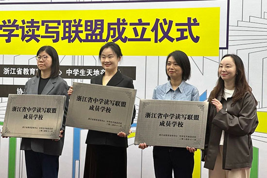 成立儀式上,副校長(zhǎng)朱曉慧作為學(xué)校代表領(lǐng)取“浙江省中學(xué)讀寫聯(lián)盟成員學(xué)校”銅牌,學(xué)生處處長(zhǎng)楊育萍領(lǐng)取浙江省中學(xué)讀寫聯(lián)盟頒發(fā)的指導(dǎo)師聘書。