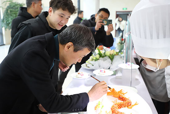 在技能展示區,學生們運用雕刻技能,以學校“蓮文化”為特色,用白蘿卜雕刻出仙鶴,心里美蘿卜雕刻荷花,青蘿卜雕刻荷葉,芋頭雕刻假山等內容,展現了學生們的精湛技藝和對傳統文化的深刻理解。特別值得一提的是,草魚做的龍身和胡蘿卜雕刻的龍頭,在紹興市教育局長現場親自為龍點睛后,更顯栩栩如生;面點制作的福娃和菊花豆腐等作品,既展示了學生的創意和技藝,也體現了學校對傳統文化的傳承和創新。