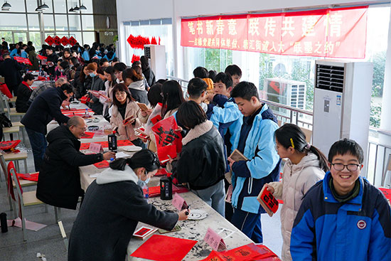 校黨委書記范曉春與硯邊歲月書法社骨干成員徐新奇、鄭強勝、蔣雪揚、許韜等共同參與,特邀學校黨建共同體單位嘉興大學建工學院黨委書記童勇軍以及國家級工藝美術大師童人杰,省書協會員柴林根、江軍和塘匯街道人大工委主任張玨一行來校,共同參與寫福送春聯活動,現場洋溢著一派其樂融融、福氣滿滿的祥和氛圍。