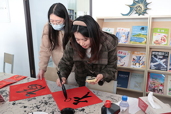 參與活動的師生們也躍躍欲試,參照字帖,手握毛筆,在紅紙上盡情揮毫。筆鋒游走,墨香四溢,一個個或青澀稚嫩、或圓潤可愛的“福”字躍然紙上,飽含著大家對新春的美好祈愿。