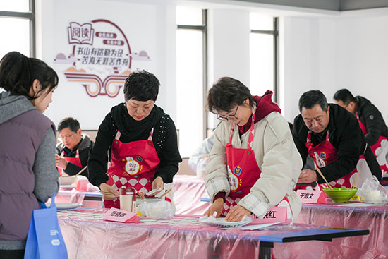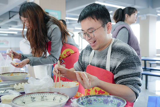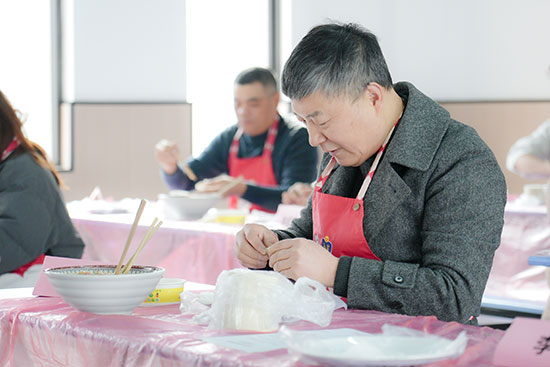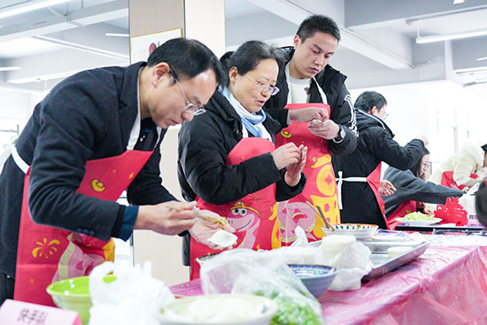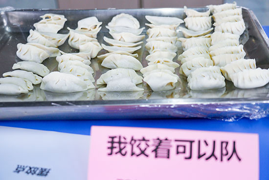 比賽分為團體賽、個人賽兩個項目,分別從時間、質量打分。團隊賽還設了最佳人氣餃子獎,邀請30名試吃評星員給最好吃的餃子亮星?,F場氣氛和諧、笑語不斷,大家時而探討心得,時而過招切磋,齊心協力,分工合作,一張張潔白的面皮配上精心調好的餡料變成了一個個胖嘟嘟、圓鼓鼓的餃子,每一個餃子都承載著對新年的美好祝愿。