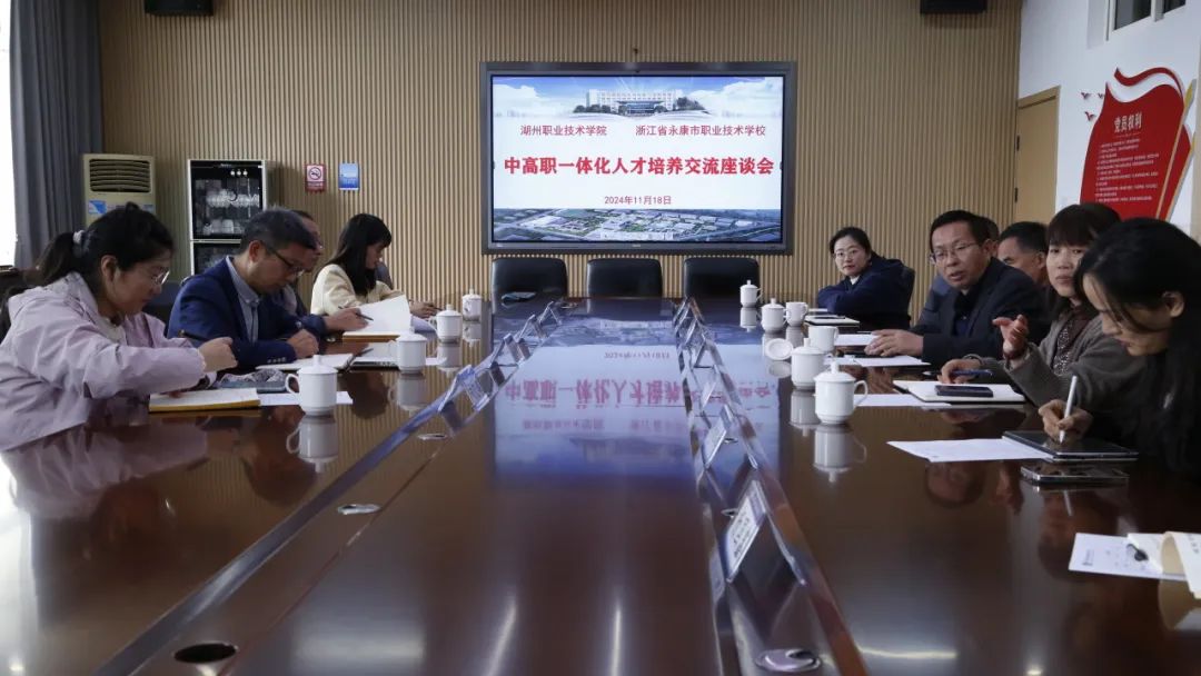胡國榮則詳細介紹了湖州職業技術學院的長遠發展規劃、新校區建設情況以及二級學院的設置現狀。他表達了對兩校未來進一步加強溝通交流的期待,并希望雙方能夠聚焦核心課程、教育教學等關鍵銜接環節,共同推動優勢互補、創新融合的中高職一體化協同育人模式,不斷提升人才培養的質量與水平。