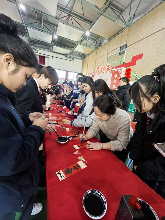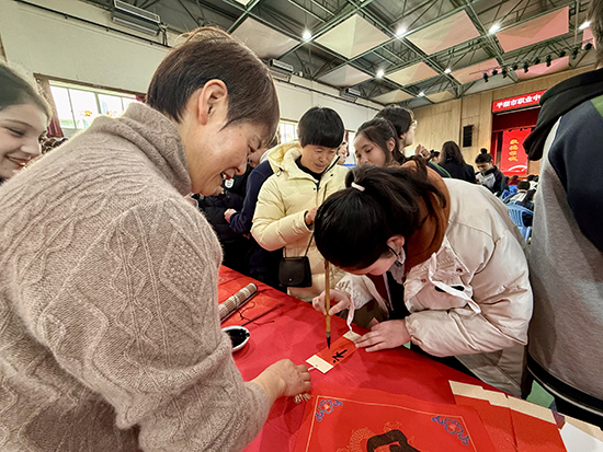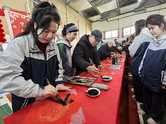 活動現場,紅紙鋪展、墨香縈繞、歡聲笑語。老年學員與新疆學子共同挽袖執筆,飽蘸濃墨,筆走龍蛇,一停頓、一落筆,楷書、行書、隸書等各種字體的“福字”在巧手下誕生。一幅幅對仗工整、韻律優美的對聯深受大家的喜愛。一張張小小的書簽飽含對親人、朋友的祝福。這跨越年齡與民族的筆尖對話,正書寫著新時代最美的“中國福”。
