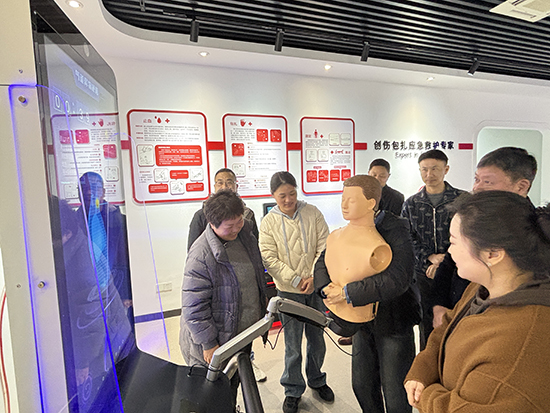 隨后,考察團領導重點參觀了學校特色內容之一——生命安全體驗館。在體驗館內,考察團成員親自體驗了各種應急救護設施,深入了解學校在生命安全教育方面的創新舉措。考察團對昌碩分院在培養學員生命安全意識、提高自救互救能力方面取得的成果給予了高度評價。