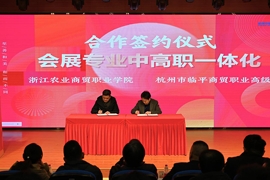 杭州市臨平商貿職業高級中學集團理事長、校長沈琪與浙江農業商貿職業技術學院黨委委員、創意設計學院院長呂玉龍簽訂會展專業中高職一體化五年制人才培養協議,搭建人才培養“立交橋”。
