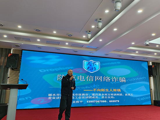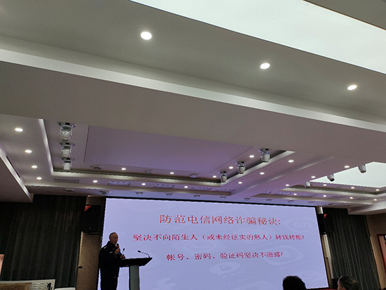 會議第二項內容開展反詐培訓。遂昌縣退教協和杭州銀行邀請麗水市公安系統市級教官、遂昌縣公安局吳偉平開展《你我同心 反詐同行》培訓。吳教官圍繞“防范電信網絡詐騙——不向陌生人轉錢”,用一個個案例、一組組數據,講了發生在省外、省內、麗水、遂昌身邊的近年來電信網絡詐騙發案情況、發案形勢、被騙原因及慘痛的教訓。提醒大家切勿將自己的賬號、密碼、驗證碼泄露,堅決不向陌生人(或未經證實的熟人)轉錢轉賬!