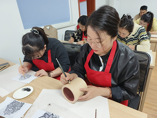 在實操環節,學員們在李老師的指導下,紛紛拿起刻刀,投入到陶藝雕刻的創作中。學員們表示,百合花這一圖案看似簡單易描摹,但要在陶瓷盤與陶瓷罐上精準無誤的雕刻出其細膩形態,實則是對技藝精湛程度與專注力的一次深刻考驗。他們深刻認識到,這不僅是對個人技能的挑戰,更是對藝術追求與匠心精神的深刻體現。