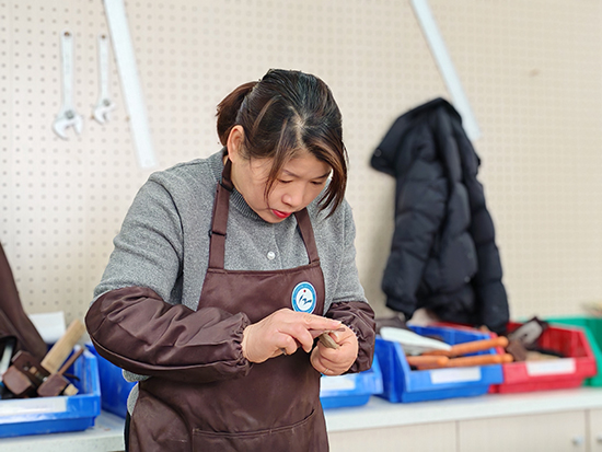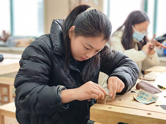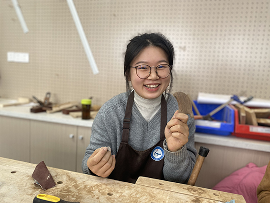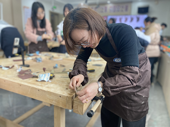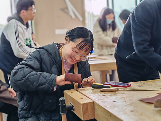 在木工坊內,女教職工們熱情高漲,全身心投入到手工制作中。活動伊始,木工專業的老師和學生們為她們講解了制作按摩梳的步驟和要點。隨后,大家便開始了精心的創作。首先,她們拿起戳刀,小心翼翼地將木梳的棱角磨平,確保每一個細節都處理得恰到好處。接著,用砂紙進行反復打磨,使木梳表面變得光滑細膩。最后,為木梳上蠟,增添光澤與質感,一把把精美的按摩梳在她們的巧手中逐漸成型。