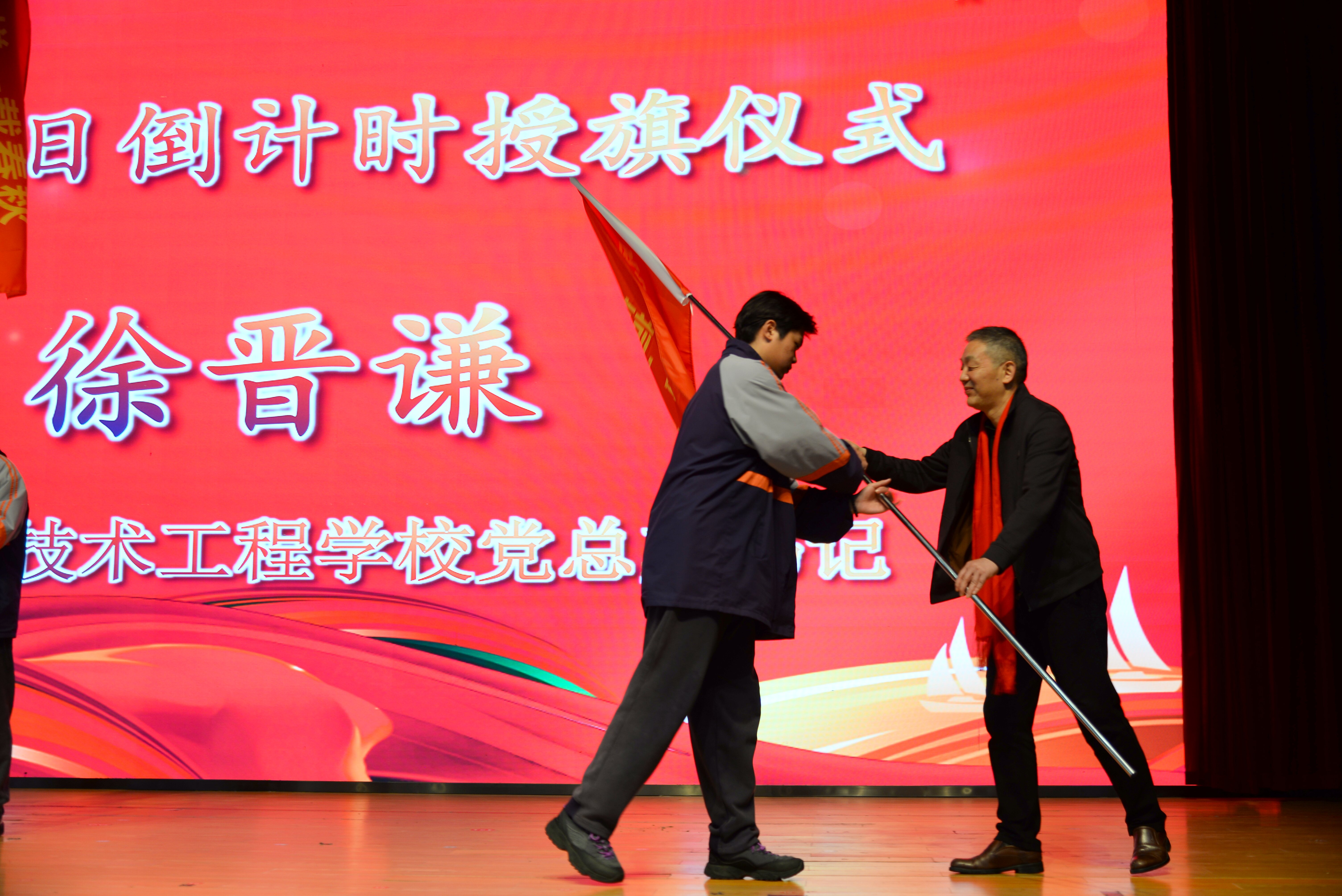 在授旗環(huán)節(jié)中,徐晉謙為各班學生代表授旗,旌旗獵獵揚起必勝信念!誓言錚錚激蕩凌云壯志!讓我們將此刻的熱血,化作筆下千鈞之力!相信你們一定能夠在未來的時間里,嚴于律己、努力學習,為自己的青春填上濃墨重彩的一筆,實現(xiàn)自己的人生理想!