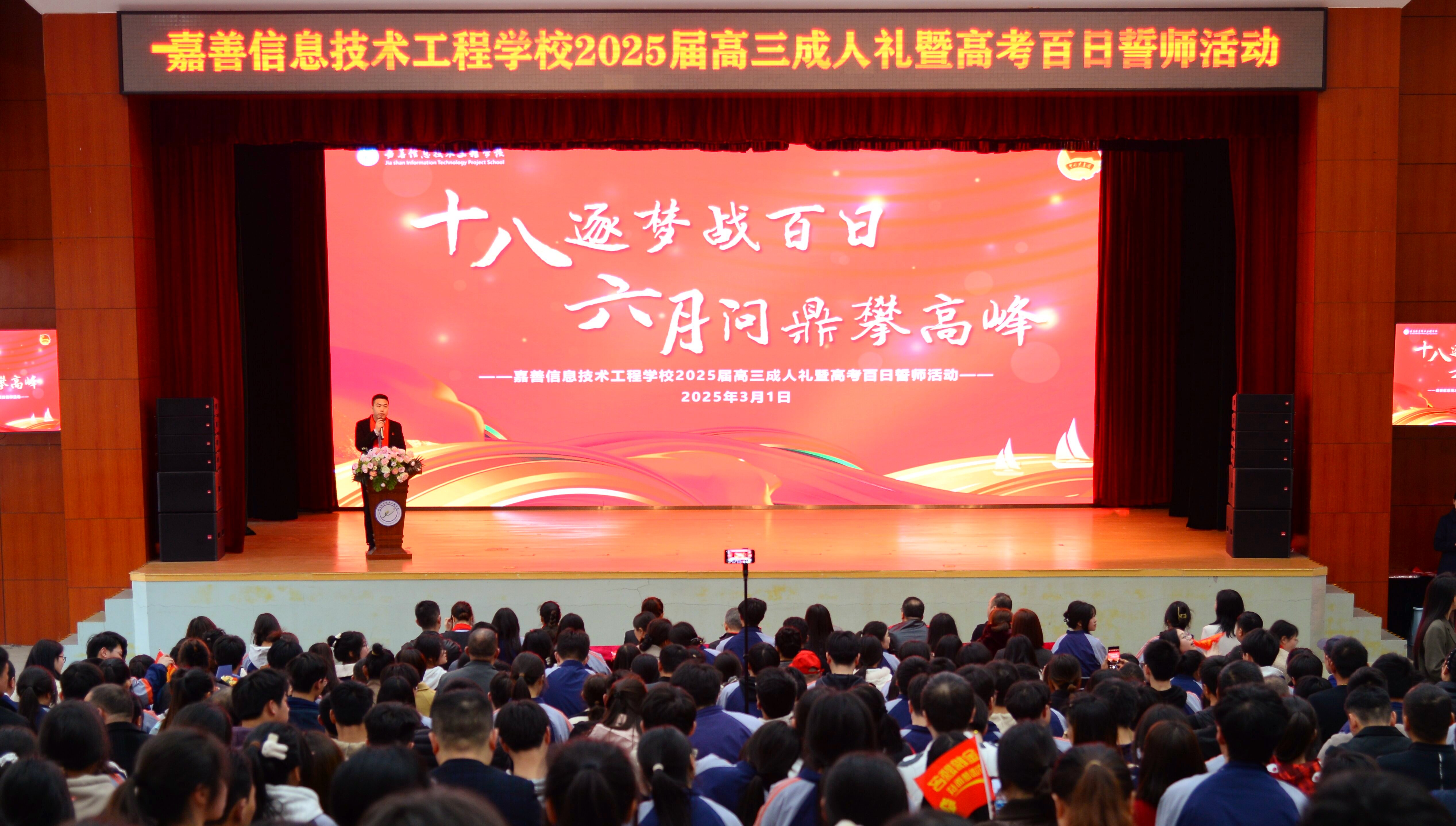 3月1日下午,嘉善信息技術工程學校高職年級部在學校大報告廳舉行主題為“十八逐夢戰(zhàn)百日,六月問鼎攀高峰”的2025屆高三成人禮暨高考百日誓師活動。全體2025屆高三師生及家長齊聚一堂,共同見證信息學子邁向成人、備戰(zhàn)高考的重要時刻。校黨總支書記徐晉謙,校黨總支副書記、校長邱雨馨,校黨總支副書記周建平,副校長沈灝、沈文慧,政教處主任王聰,教務處主任黃建芳出席活動,活動由高職年級部主任董艷陽主持。