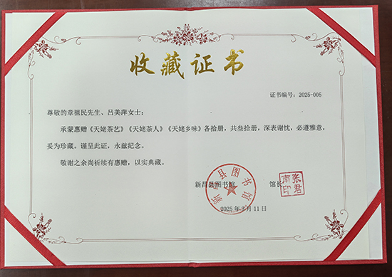 3月11日,章祖民與呂美萍專程前往新昌縣圖書館,向該館捐贈了這套新出版的培訓系列教材。縣圖書館地方文獻工作人員倪蘇珍表示,這套教材豐富了圖書館的地方文獻館藏,為讀者了解新昌鄉味、茶人和茶藝提供了寶貴的資源。