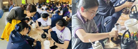 此外,宋韻點茶和非遺手藝錦灰堆也是此次研學(xué)活動的亮點之一。在宋韻點茶體驗中,同學(xué)們體驗了宋代點茶的技藝和禮儀,感受了傳統(tǒng)文化的韻味。而在錦灰堆制作過程中,同學(xué)們則發(fā)揮創(chuàng)意,將傳統(tǒng)技藝與現(xiàn)代審美相結(jié)合,創(chuàng)作出了一件件獨具特色的手工藝品。