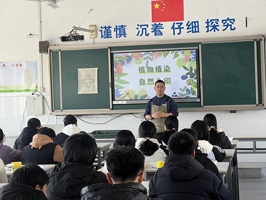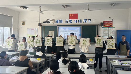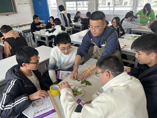趙晨老師的《植物植染 自然之印》課程更是將互動性推向高潮。趙老師利用浦口中學勞動基地內的植物進行現場教學,并演示拓染技巧。同學們分成小組,親自動手進行貼、拓、揭、固、掛等步驟,每個環節都有老師的悉心指導和同學們的互助合作。在創作過程中,同學們相互交流心得,分享創意,不僅體驗了傳統技藝,還在互動中增進了友誼。