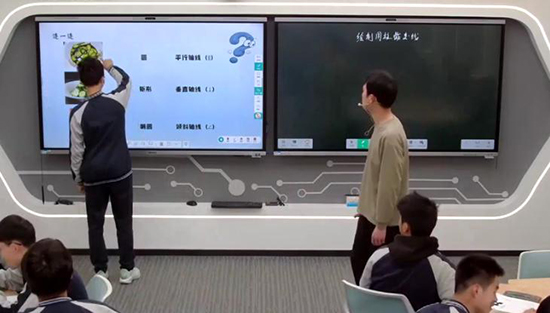 在桑田校區智慧教室中,寧波職教中心學校俞杰老師的《繪制圓柱截交線》以“黃瓜的多樣切法”為生活化情境貫穿始終,通過趣味案例引導學生理解圓柱截交線的三視圖繪制原理,課堂導入環節充分調動了學生的積極性,情境創設與知識點融合較為自然。學生在觀察黃瓜不同切割方式的過程中,能直觀感知截交線的形態變化,初步建立了空間幾何與投影的關聯性,這一設計體現了“做中學”的理念,課堂氛圍活躍,學生參與度較高。整堂課教學容量與學情匹配,能夠有意識地進行分層教學,有效達到了教學的目標。