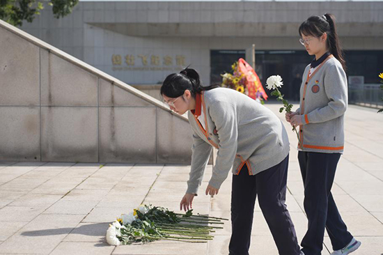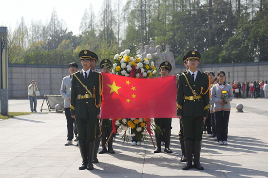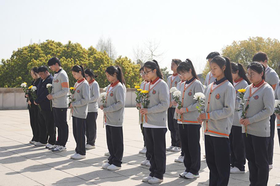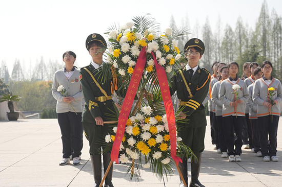 全體師生垂首肅立,深切默哀,儀仗隊(duì)和學(xué)生代表為革命烈士敬獻(xiàn)花籃和花束,以表達(dá)對先烈們的深切緬懷與崇高敬意。