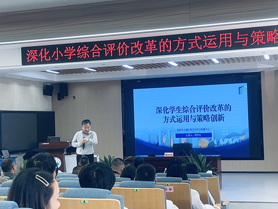 杭州市上城區教育評估與監測中心書記、主任兼杭州市上城區教育學院副院長繆華良作了《深化小學綜合評價改革的方式運用與策略創新》的報告。繆華良從“‘以評促育’—小學生綜合評價改革的追求”“小學生綜合評價改革的實施途徑”“小學生綜合評價改革的技術應用”“小學生綜合評價改革的創新項目”等結合具體案例侃侃而談,憑借深厚的專業知識和豐富的實踐經驗,詳細指導綜合評價的操作方法與流程,秉持“評價成就‘完整的人’”這一先進理念,深刻指出應以全要素融通評價為核心,激勵每個學生積極主動、全方位健康成長,詳細列舉了一系列切實可行的實施路徑。