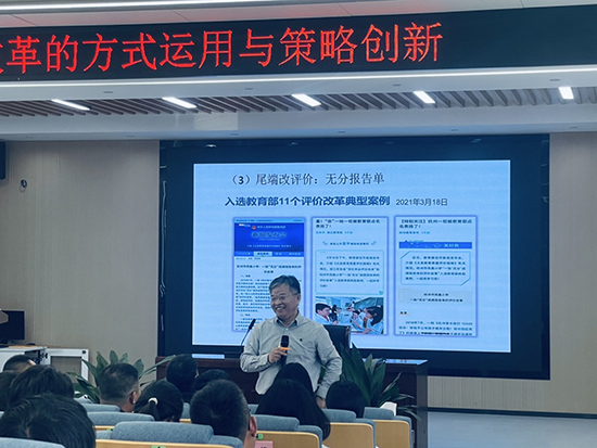 報告結束后,繆華良就“如何激發資深教師參與教學述評的積極性?”“針對隨遷子女比例較高的現狀,在推進教育綜合評價的改革背景下,如何去平衡學業提升與興趣特長?”“跨學科主題學習評價應注意哪些方面?”等問題與在座教師互動交流,讓教師明晰了“評價改革需扎根課堂、服務教學”的核心原則,正如《深化新時代教育評價改革總體方案》所強調的“破立結合”的理念,唯有打破傳統評價慣性,才能讓改革真正落地生根。