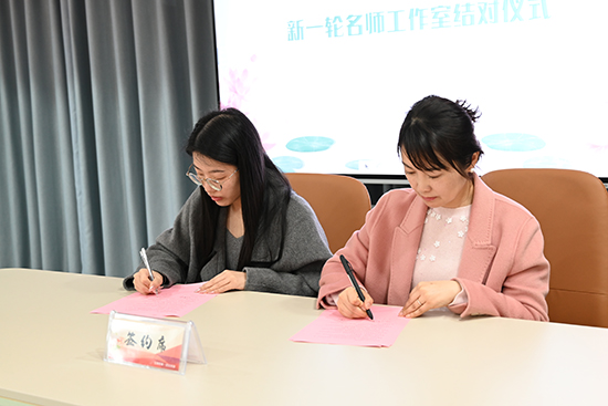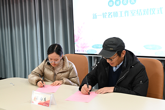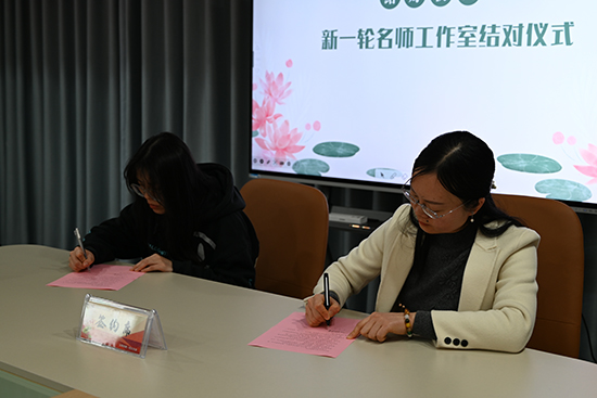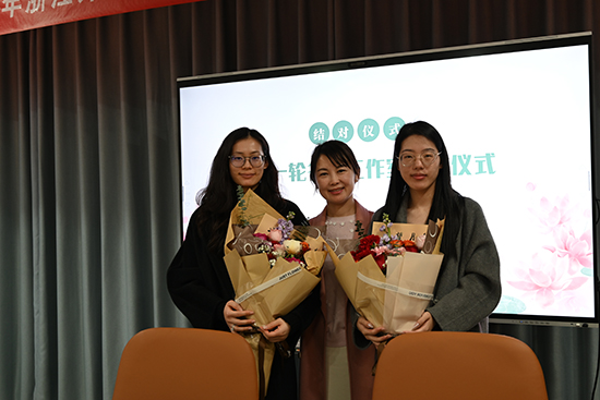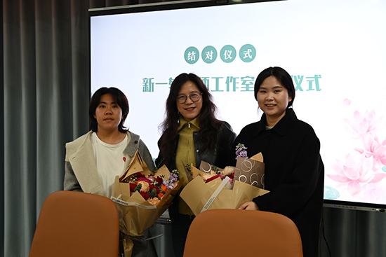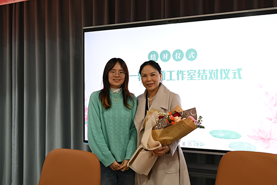 第二環節由學??蒲刑幹魅涡荑蠢蠋熜x2025年學校名師工作室納新成員和新一輪名師工作室結對名單。隨后,活動進入了結對簽字儀式環節。新進學員與導師們鄭重簽訂了結對協議,確立結對關系。學員們為導師獻上鮮花,表達了對導師的敬意與感激之情。這一環節不僅象征著教育薪火的傳承,也體現了學院對青年教師成長的重視與支持。