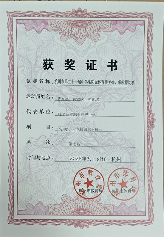 在剛剛落幕的杭州市中小學(xué)生街舞比賽,杭州市中小學(xué)生健美操、啦啦操比賽中,臨平商貿(mào)職業(yè)高級(jí)中學(xué)校健美操隊(duì)一路過關(guān)斬將,取得了非常優(yōu)異的成績!街舞組勇奪二等獎(jiǎng),競技三人操第七名,花球啦啦操三等獎(jiǎng)——三面戰(zhàn)旗,書寫的是團(tuán)隊(duì)拼搏的熱血故事,更是教練與隊(duì)員們用智慧與汗水澆筑的青春勛章!