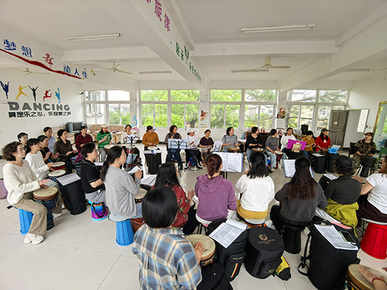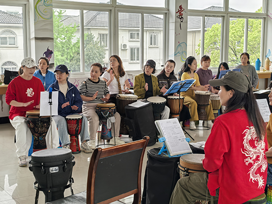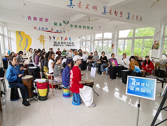 4月12日下午,安吉縣社區教育學院昌碩分院(昌碩成校)市民夜校的非洲鼓班迎來了本學期第三次授課。教室里洋溢著歡快熱烈的氛圍,在專業老師的指導下,40多名學員全情投入,用雙手拍打出充滿活力的節奏。