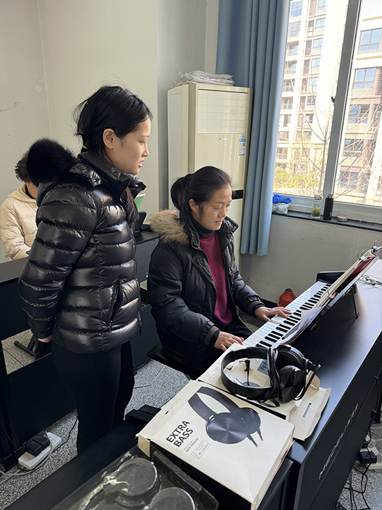 開課當日,教室里洋溢著歡快的氛圍,黃老師從認識琴鍵開始到簡單的指法練習都進行示范演奏,并一對一指導。這群“年輕的老學生”在黑白琴鍵間叩響了屬于他們的幸福樂章。