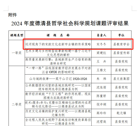 近日,德清縣社會(huì)科學(xué)界聯(lián)合會(huì)公布2024年度社科課題評(píng)審結(jié)果。德清職業(yè)中專宋冬冬老師主持的課題《運(yùn)河視角下的宋韻文化在新市古鎮(zhèn)的傳承策略》榮獲全縣一等獎(jiǎng)(第一名)。