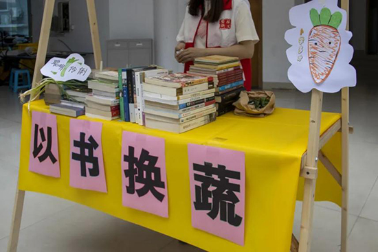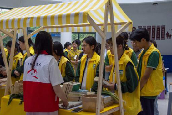 活動現場,職教中心的學生們帶著精心挑選的閑置書籍來到暨北社區,參與“以書換蔬”公益活動。居民們用自家種植的新鮮蔬果交換心儀的書籍,這一創新形式不僅實現了資源的循環利用,更促進了知識與愛心的傳遞。書籍的流動拉近了校園與社區的距離,也讓“奉獻、友愛、互助、進步”的志愿精神得到了生動詮釋。