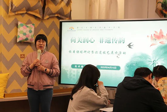 評課后,各校專業組長觀摩了浙江開放大學臨平學院藝術設計教研組開展的“荷美潤心,非遺傳韻”校本課程研討暨非遺技藝展示活動。
