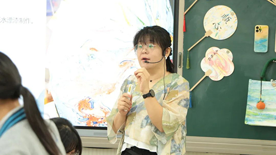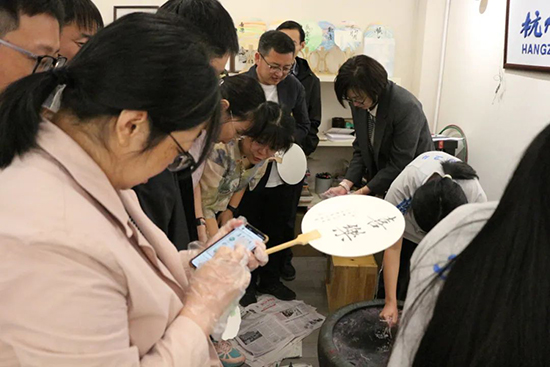 隨后,董倩倩老師和丁一蘭老師通過生動的講解和精湛的演示,現場教授了漆扇的制作方法和扇面的書寫技藝。同時,也讓參與活動的師生們親身體驗了非遺文化的魅力。