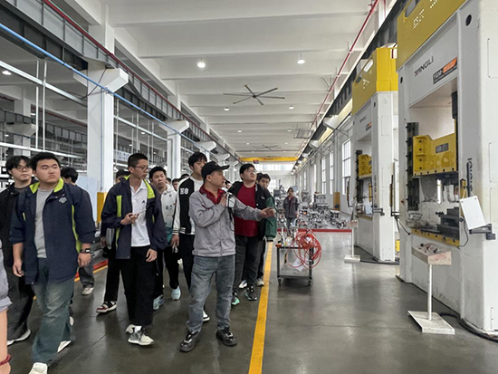 4月24日上午9時,學生們出發前往公司,在公司辦公室主任王意博的引領下,學生們首先參觀了吉沃科技的生產車間。生產線上的工人們熟練地操作著各種高精尖設備,汽車零部件從原材料到成品的每一個生產環節都盡收眼底。來到模具車間cnc工作區域,學生們近距離觀察了工人們如何操作精密的機械設備,大家紛紛感嘆科技企業的生產環境像一個充滿未來感的‘科技實驗室’,并表達了特別想要進入吉沃科技學習cnc數控加工技術的愿望。