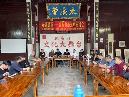 4月23日上午,諸暨市博物館副館長俞琦杰,紹興市拔尖人才、中國書法家協會會員、原諸暨市書法家協會主席、諸暨市三賢研究會會長許紹滿,中國書法家協會會員、諸暨市收藏協會會長丁曉爾等專家及魏廉書畫社社員等30余人齊聚諸暨市楓橋鎮魏廉村文化禮堂,舉行“老蓮遺韻——魏湘書畫藝術研討會”。