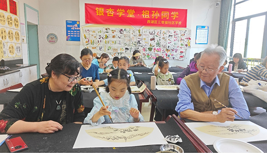 4月29日,杭州市西湖區放春假的一群孩子們相約走進西湖區三墩鎮社區學校,與老年大學堂的爺爺奶奶們一起,學習杭州市非遺項目——扇面藝術。這次活動是該校“銀杏學堂、祖孫同學”公益學習活動的系列主題,目的是通過西湖區優質社區教育資源覆蓋社區,促進代際交流互動,構建全面立體的西湖全民終身教育體系。
