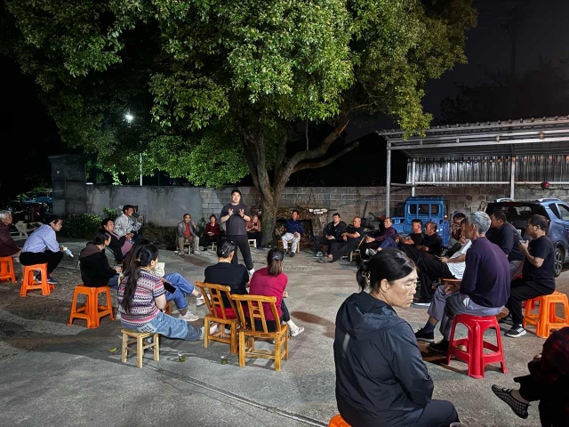 夜幕悄然籠罩大地,社區的空地上卻燈火通明、熱鬧非凡。一棵枝繁葉茂的大樹宛如忠誠的衛士,守護著樹下圍坐成圈的居民們。大家臉上洋溢著期待,眼神中閃爍著求知的光芒,認真聆聽著培訓的內容。