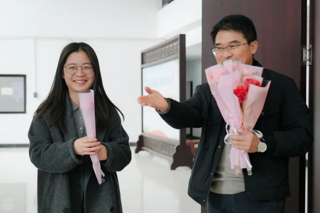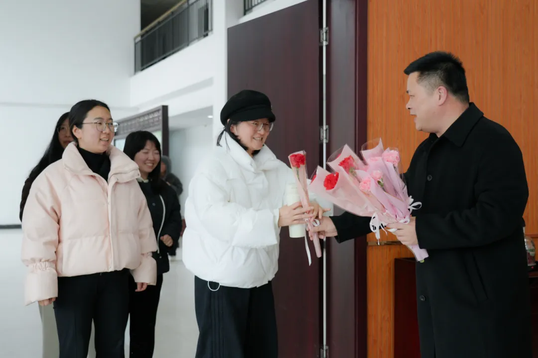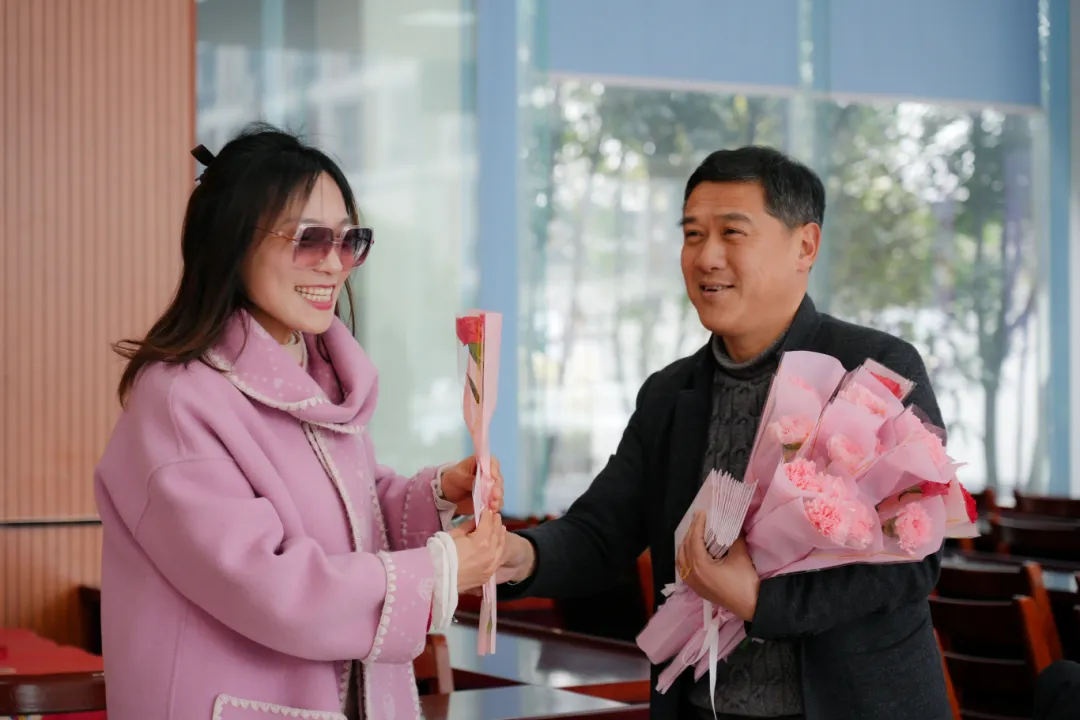 活動當天,校黨委副書記、校長李志文,副校長、工會主席龔磊,副校長葛魁早早便抵達活動現(xiàn)場,他們手捧鮮花,滿臉笑容地迎接每一位女教職工的到來。當女教職工們接過校領導送上的鮮花和祝福時,幸福的笑容在她們臉上綻放開來,恰似春日里盛放的繁花。而這些飽含心意的祝福,是對女教師們?nèi)粘D拧⑿燎诟冻稣J可,如同春日暖陽,驅散寒意,溫暖著每一位女教師的心田。