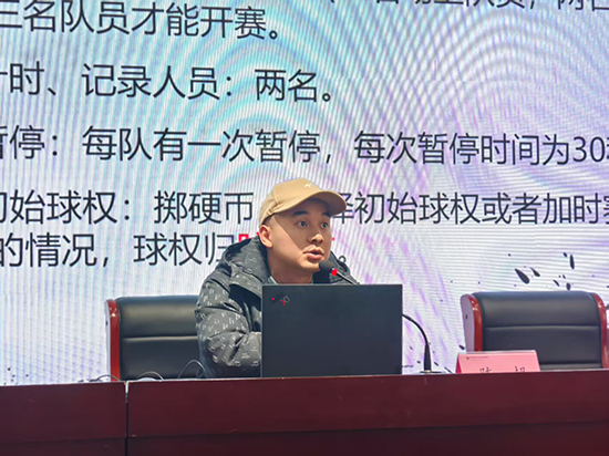 隨后,陳超老師為全體參賽隊員和裁判員進行了詳細的規則解讀和培訓。陳超老師結合自身豐富的執裁經驗,細致入微地講解了籃球比賽規則、裁判手勢以及注意事項,并針對同學們容易出現的犯規動作進行了重點講解和示范。陳老師對裁判員提出了嚴格要求,務必做到公平對待每一支隊伍、公正吹響每一聲哨音;同時,也殷切期望參賽隊員們能夠始終秉持尊重對手、尊重裁判的體育精神。培訓期間,同學們全神貫注,積極互動。