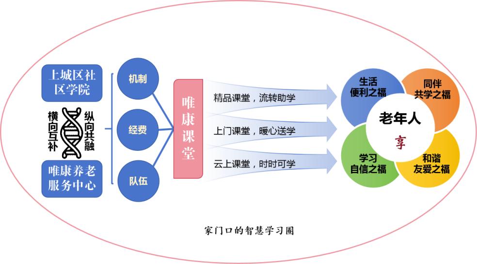 “唯康課堂”是上城區社區學院與浙江省唯康為老服務發展中心聯合打造的智慧助老學習項目,整合了全區的教育資源,通過公心為老+民力相援,形成可持續、可復制的“2+3+4”的推廣形式。兩主體:社區學院和優質民辦養老助老資源聯動,形成區-街-社-站點四級網絡。唯康課堂探索了流轉助學的精品課堂,暖心送學的上門課堂,時時可學的云上課堂三種教學形式,使智慧學習圈圈起生活便利之福、學習自信之福、同伴共學之福和和諧友愛之福(四福),讓服務跟著老人走、幸福跟著老人走。