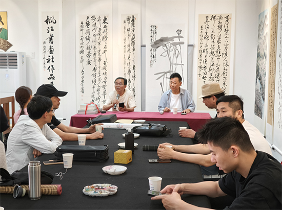 互贈了《翰墨楓橋》與《古越藝叢》。兩個社團的成員分別完成一本冊頁的書畫創作,社員們盡己之能,精心構思,現場或書或畫,揮毫潑墨,不一會兒,風格獨特、精美絕倫的冊頁橫空出世,相互贈送留念。成員們開展筆會活動,暢談書畫實踐中的感悟,取長補短。一起走進新開館的楓橋三賢館學習。
