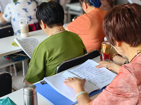 新歌教唱環(huán)節(jié),宋老師先是教大家唱譜,然后一句句地示范演唱,那婉轉(zhuǎn)的曲調(diào)、清晰的咬字,讓學(xué)員們聽得如癡如醉。隨后,學(xué)員們跟著輕聲哼唱。起初,大家還有些生澀,節(jié)奏和音準(zhǔn)上也存在一些小問題。但在宋老師耐心地指導(dǎo)下,一句句地糾正,一遍遍的練習(xí),學(xué)員們逐漸找到了感覺。“大家注意這個長音,要保持氣息的平穩(wěn)。”“這里的節(jié)奏要把握好,不要搶拍。”