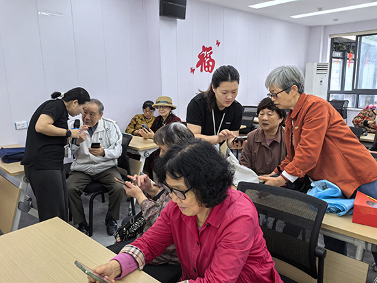 教師們走進社區,采用“一對一輔導+小班教學”模式,耐心解答操作難題,新碶成校根據老年人學習能力差異,采取分層教學模式因材施教。對學習能力較強的老年人開設集中班或線上課程,而對接受較慢的群體則采用小班教學或一對一輔導。課程內容緊密圍繞老年人日常生活需求,涵蓋微信使用(如語音通話、視頻聊天)、移動支付(支付寶/微信收付款)、健康碼操作、預約掛號、地圖導航等實用場景。此外,課程還融入防詐騙教育,增強老年人信息安全意識。新碶成校與各社區緊密合作,年輕的教師們穿梭在新碶街道各個社區,利用網格資源,聯合手機門店等,開展了一場場專為老年居民量身定制的“我教長輩用手機”智能培訓活動,2025年1—4月已對近五千人次的老年人進行了智能手機培訓,為老年人構建“數智無憂”的晚年生活支撐體系提供有力保障。
