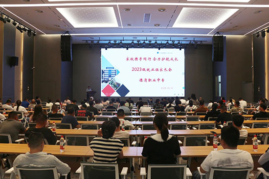 會議伊始,德清縣職業教育宣傳片率先點燃現場氛圍。鏡頭中,學生在現代化實訓室里專注操作的動人場景,讓家長們對職業學校的專業特色、實訓環境及學生成長有了更直觀的感受。