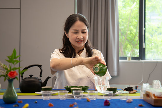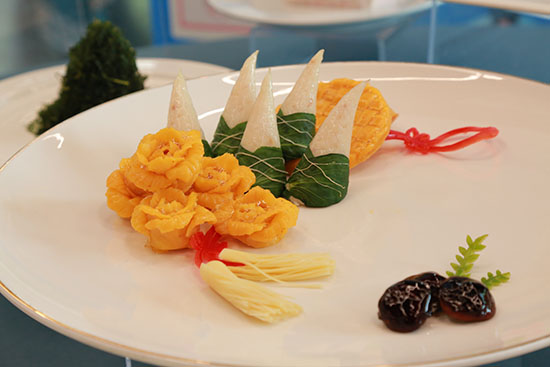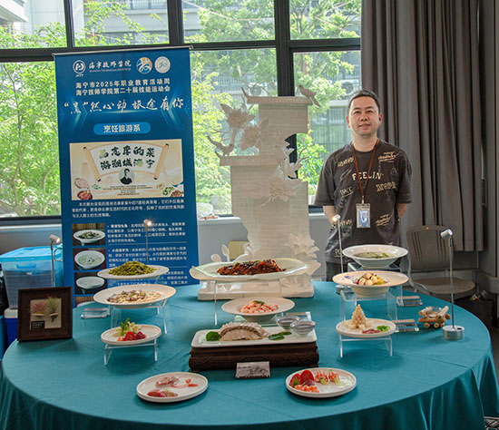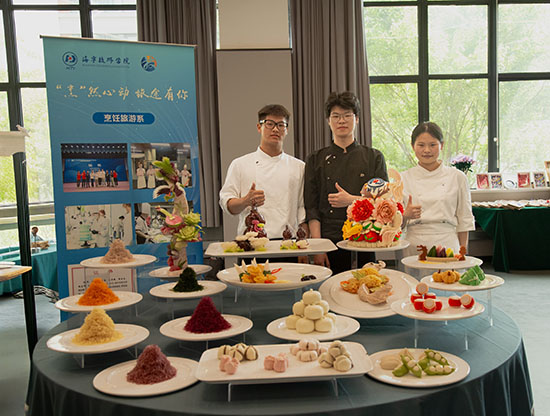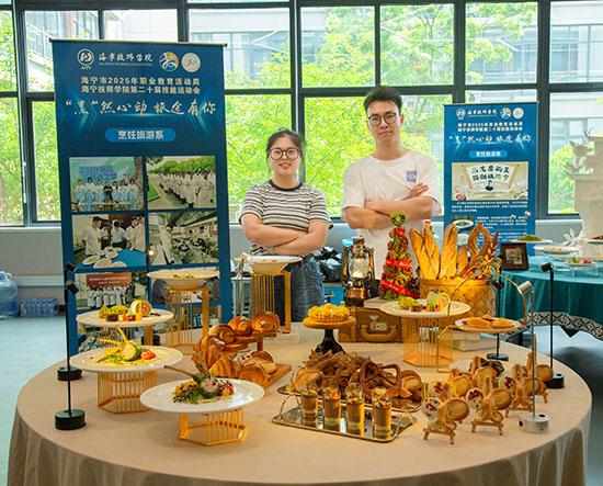 烹飪旅游系的展區飄溢著陣陣煙火氣,師生現場演示了精致的中西式糕點制作、創意冷盤雕刻及茶藝沖泡技藝等,特別是“志摩的菜”吸引了眾多參觀者駐足欣賞。