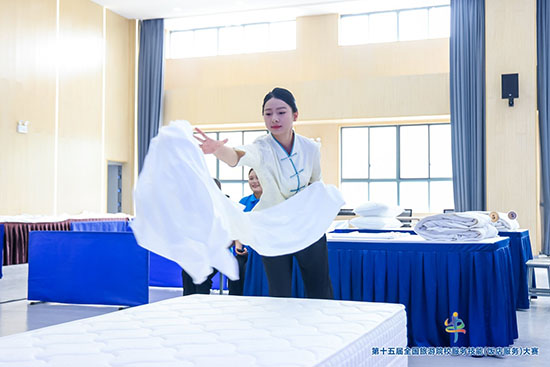 大賽分為三項內(nèi)容。其一為綜合知識理論考核,采用機考方式,時長1小時,滿分為100分,重點考察選手的專業(yè)理論基礎(chǔ)知識及綜合分析能力。其二是英語水平測試,本科院校和高職高專院校組時間約5分鐘,中職學校組時間約3分鐘,滿分為100分,通過選手與評委現(xiàn)場會話,檢驗選手的英語口語表達能力。其三為現(xiàn)場操作,其中的中式鋪床環(huán)節(jié),主要考察選手操作的熟練性、規(guī)范性。各項考核內(nèi)容全面且細致,旨在選拔出綜合能力過硬的旅游專業(yè)人才。