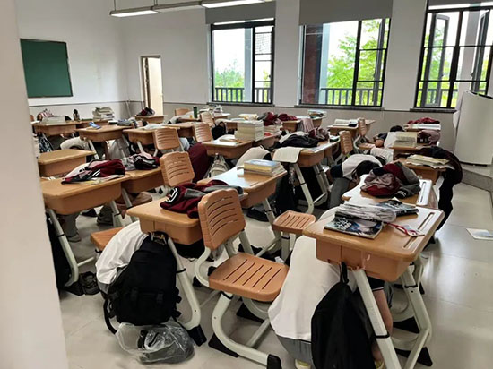 “地震來襲,緊急避險!”全體師生迅速反應,以最快速度蹲至課桌下或角落里,雙手護頭、蜷縮身體,利用課桌、墻角等“生命三角區”緊急避險,以標準姿勢抵御可能的“墜物”傷害,全體進入安全防護狀態。