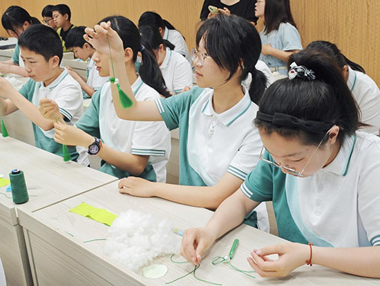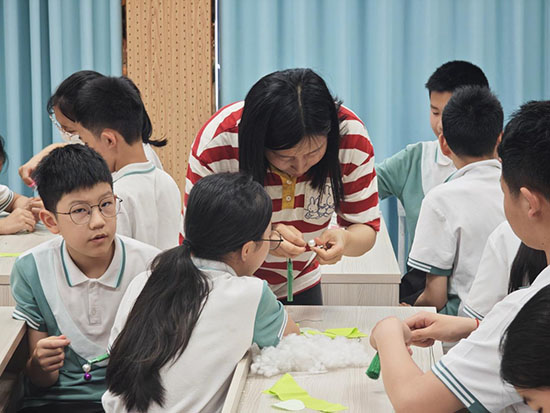 看似小巧的蓮蓬香袋,制作起來卻大有學問。在邵老師的細致指導下,同學們一步步完成創作:先串聯裝飾流蘇,再穿針引線縫制香袋主體。盡管針線活對六年級學生有些挑戰,但邵老師耐心地為每位孩子示范技巧,手把手糾錯指導。隨后,大家裝入清幽的艾草香料,封口收邊,最后用小巧的白珍珠點綴成“蓮子”,一個個精致可愛的蓮蓬香袋便躍然掌心。