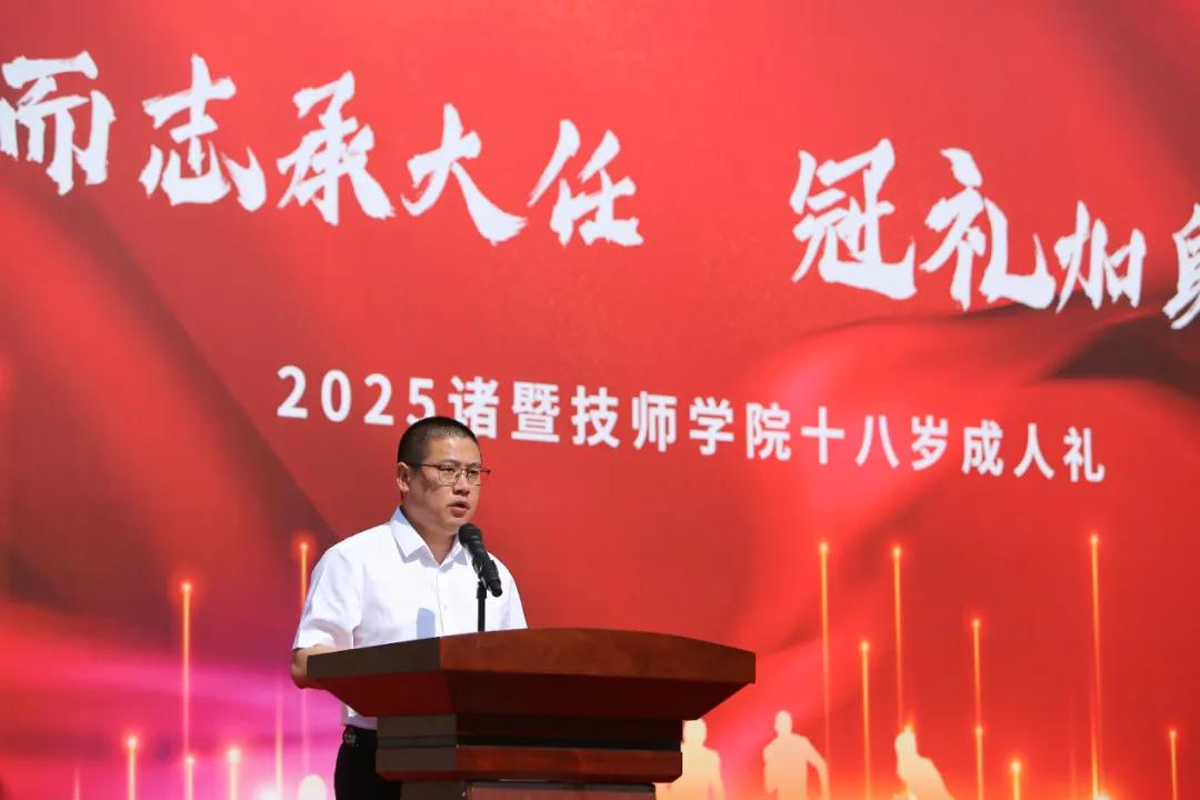 近日,諸暨技師學院舉行2025屆高三學生成人禮暨高考誓師大會。黨委副書記、校長俞杭明,副校長朱喆等學校領導,學生家長及全體高三師生齊聚,共同見證學子們邁向成人門的莊嚴時刻。