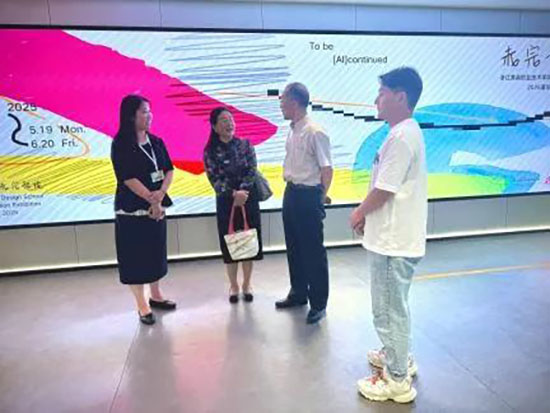 在浙江育英職業技術學院黨委書記謝鑫的陪同下,教研組一行參觀了學生靜態作品展,并觀摩了畢業秀作品匯演。此次展覽以“創新、跨界、可持續”為主題,匯聚了人物形象設計等5個專業的優秀畢業作品, 不僅展現了扎實的專業功底,更體現了年輕一代對科技賦能藝術的深刻思考。