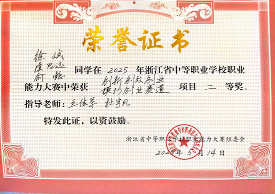 近日,2025年浙江省中等職業學校職業能力大賽“創新創效創業”模擬創業賽道圓滿收官。來自全省的40支參賽隊伍同場競技,經過4小時激烈角逐,海鹽職業教育中心參賽團隊22機電徐斌、23機器人虞思遠、23物流俞懿,憑借扎實的專業功底在比賽中脫穎而出,勇奪省二等獎。