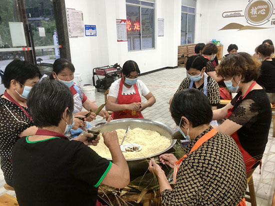 活動現場提前備好糯米、粽葉、五花肉等原料,社區學校志愿者教師現場示范卷葉、填米、扎繩等傳統包粽技法。村民中既有包粽能手展示嫻熟技藝,也有年輕志愿者邊學邊做,形成“老帶新”的生動場景。