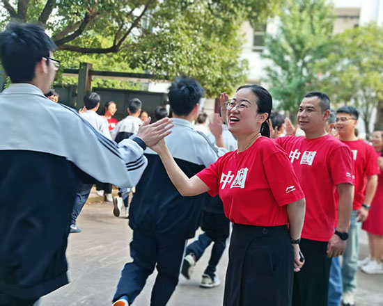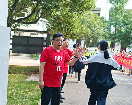 擊掌儀式現場,老師們高聲吶喊“沉著應考,金榜題名”“你們是最棒的”,學生們則信心滿滿,以燦爛的笑容和堅定的目光回應師長的期待。紅色的身影與青春的笑顏交織,成為校園里最動人的風景。