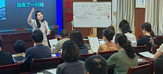 簡短而莊重的典禮后,瑞安市音樂家協會理事、舒韻藝術團團長白舒婷老師即刻開啟首堂聲樂課。從呼吸訓練到發聲技巧,她以“鼻子吸氣、嘴巴呼氣”的口訣引導學員掌握科學發聲方法,并通過膈肌打開練習糾正新手常見誤區。當《親愛的你啊》旋律響起,學員們在白老師指導下逐句練習歌詞發音,在“a、e、i、o、u”的聲韻流轉中感受音樂魅力。一位學員課后感慨:“原來唱歌不僅是藝術,更是傳遞情感的文化語言!”